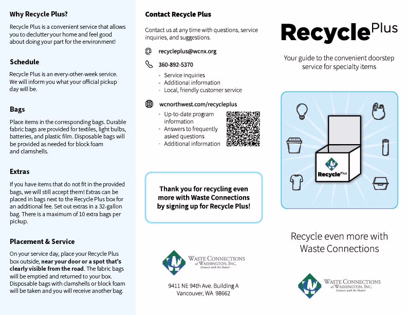 Recycle Plus is a new doorstep service provided by Waste Connections. We will collect your recyclable items that cannot go in your blue cart, and items to be donated or reused within our local community.